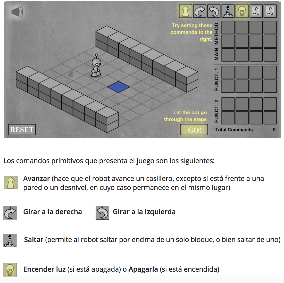 El objetivo es lograr en cada nivel que el robot logre prender la o las luces ubicadas en los cuadrados azules del piso. Para ello, el usuario cuenta con una serie de acciones en forma de íconos (similares a los bloques de Pilas Bloques) y una grilla en la que ubicarlas. El juego ofrece, además, la posibilidad de definir dos procedimientos (denominados funciones), aunque en los primeros niveles no es necesario utilizarlos.